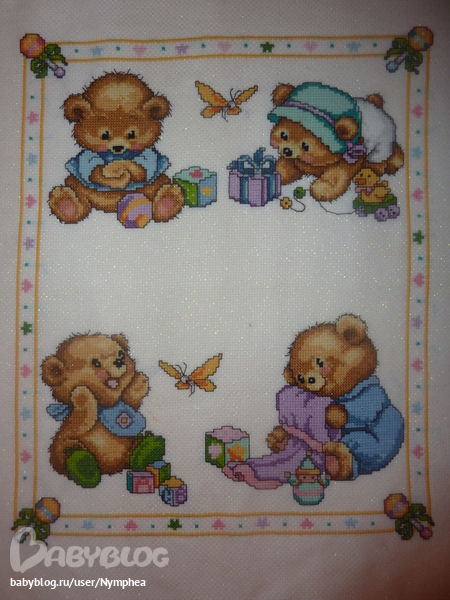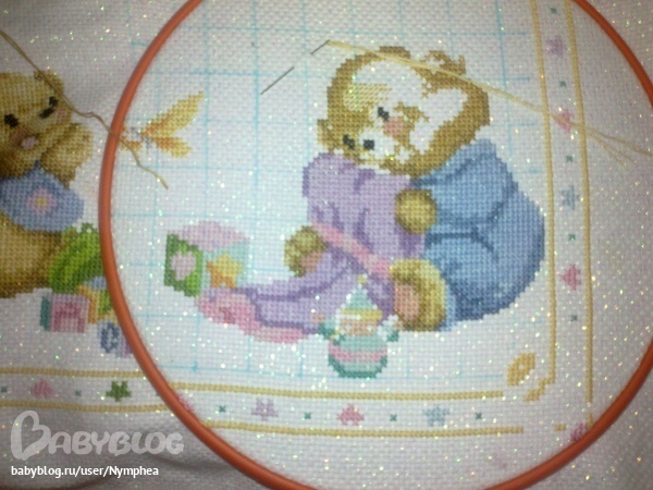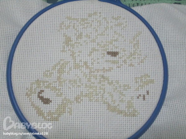 Мишка такой упитанный, клевый! НЕ вздумай его бросать, пошила немного белым по прямой(том более по прямой намного быстрее шить), как надоест сразу бери другую вышивку, так и дело продвигаться будет!