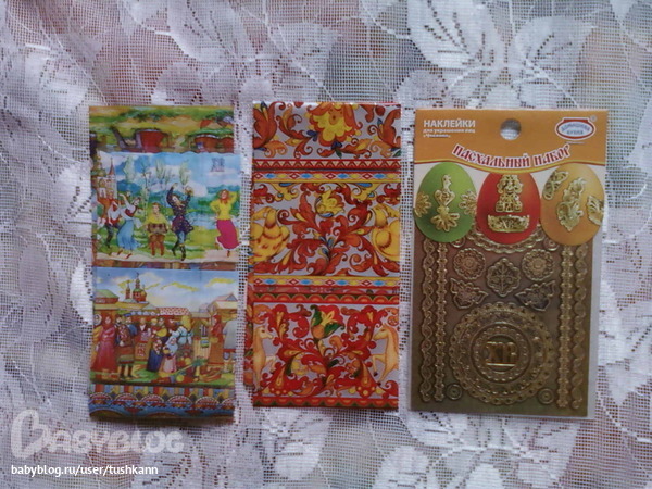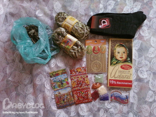 An-na))) Она попросила у меня отшитый наборчик с вышивкой, и в ответ прислала мне целую посылочку с разными приятностями для всей семьи.