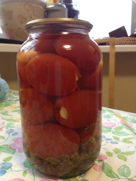 Самая, навероное, шокирующая часть подарка! Соленые помидоры!!! Еще не пробовали, подождем в гости кого-то из родителей, а то вдвоем мы такую банку не осилим)))