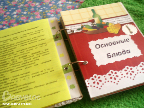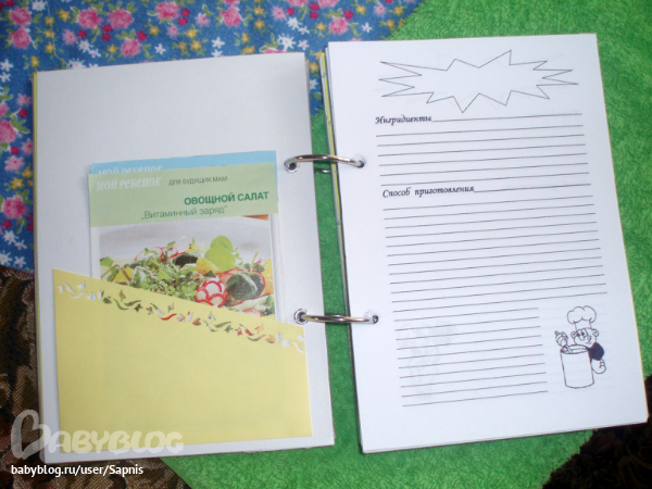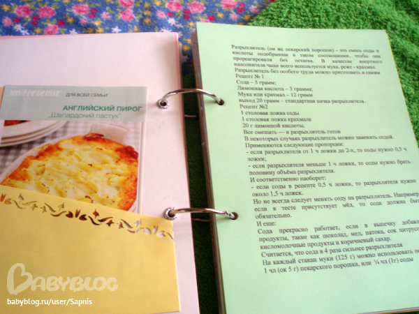 На форзаце очень много полезной информации, на разделителях есть кармашки для записочек и Маришка заполнила их интересными рецептами =)