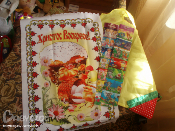 к Пасхе рушничок и термонаклейки на яйца с ангелочками и на детскую тематику (авроде сказки, но доча сразу забрала и не дала маме рассмотреть, как и замечательные книжечки со сказками малышам)