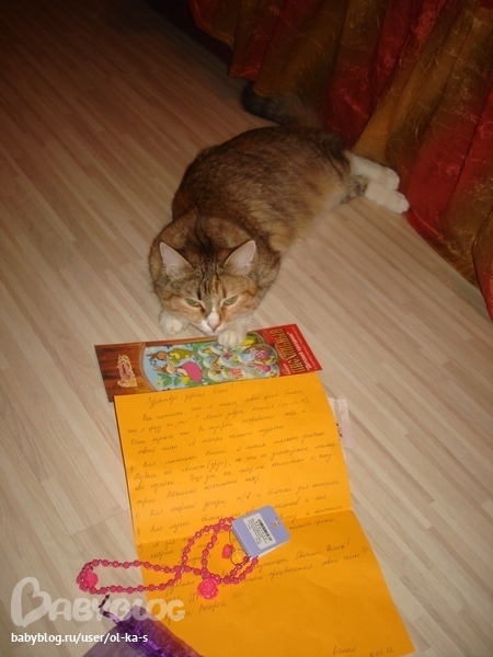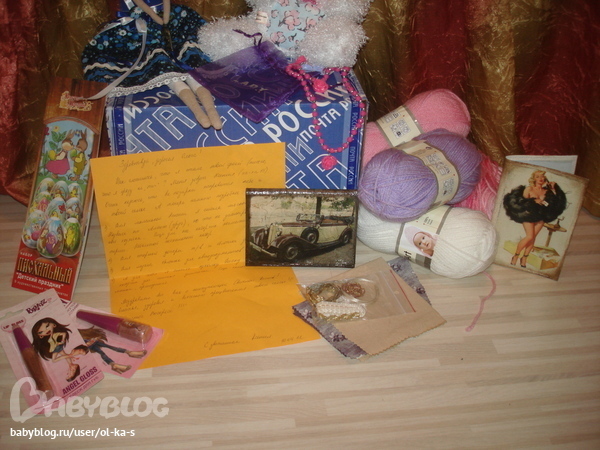 Еще водичка туалетная ( в кадр не попала, т.к отправилась сразу на полочку), чай (сразу на работе остался) и еще разные нужности - детская косметика, бусики, набор для шитья улиточки, пасхальные наклеечки, стразики для маникюра!!!! Вот сколько радости! И письмо от нашей феи мы читали всей семьей!