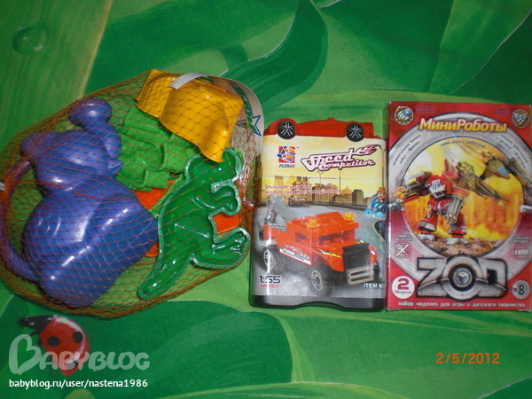 Для Сашеньки-песочный набор,для Никиты-минироботы и сборная машинка.Набор уже опробован в песочнице-доча довольна!Никита играет с роботами каждый день.он вообще любит игрушки такого вида!спасибо,Ириш!Машинку пока припрятала(нужно продлить удовольствие ; ))))