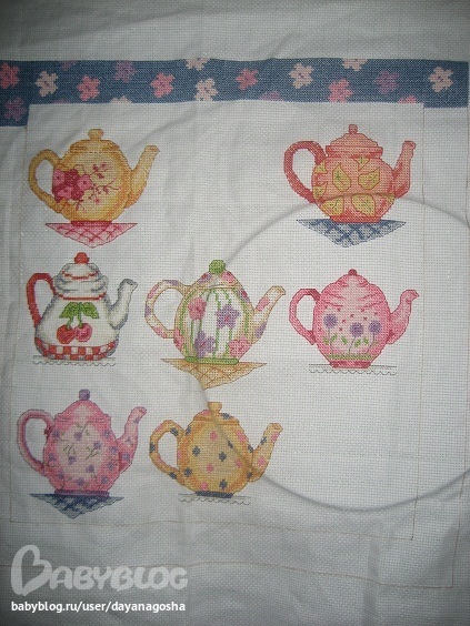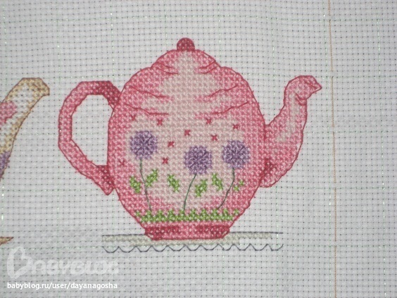 Замечательный чайничек))))))))))) А у Вас полной схемы нет? Только свой кусочек??? Я сейчас чашки вышиваю на кухню, очень хотелось бы такие чайнички)))