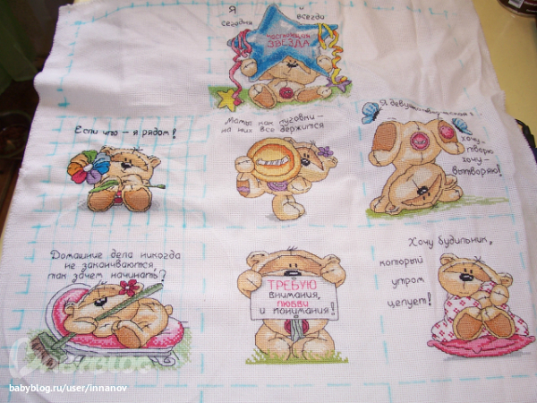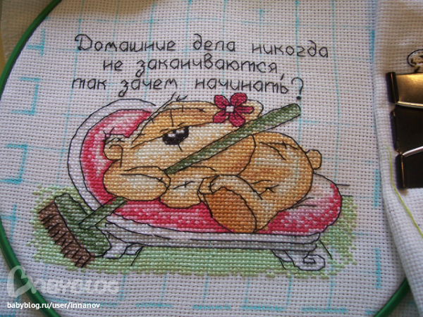 Вот, получилась такая дамочка. Хозяюшка, мне ниток 3081 и 3244 ( розовый и св.зеленый) не хватило по чуть! На фото ниже покажу где надо кусочки дошить. У меня к сожалению не было в ниличии таких цветов(((