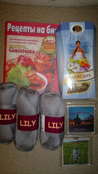 пришла мне бандероль от Эльвиры, за что ей огромное спасибо! Ниточки я конечно люблю, уже придумала что связать, да и готовить тож люблю. И целых два магнита.