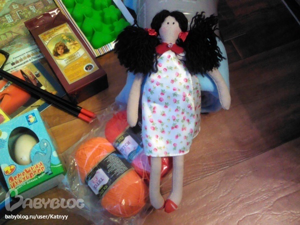Первое что увидела, когда открыла, была очаровательная Тильдочка. На фото не передать...она обалденная! ..прости за качество фоток, как обычно это бывает, фотик сел, боялась, что не успею запечатлеть все богатство...)