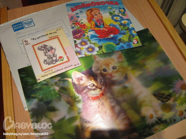 СПАСИБО!!!!!!!!!Чудесная книга для Арсюши(как проснётся,почитаем и рассмотрим рисунки),клёвые котики и трогательный зайчик(набор для вышивания)