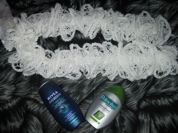 Беленький, аккуратненький, ажурненький, нежненький шарфик! Я уже примеряла - мне очень к лицу))) Сын коряво меня сфоткал,поэтому себя не выкладываю) Мужу ванные принадлежности - к слову сказать, он был очень приятно удивлен, вроде как посылочке мне, а для него тоже есть подарочки!