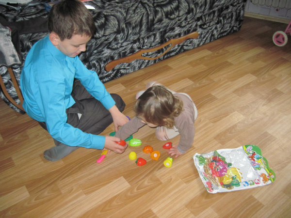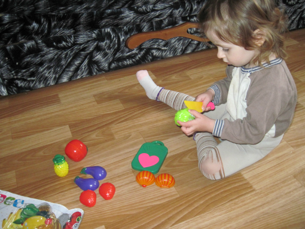 и с удовольствием разрезала овощи пополам. Девочка она у нас практичная, такие игрушки ей само то,т.к. с ними можно совершать действие. А тут режешь и тебя не ругают, а хвалят)