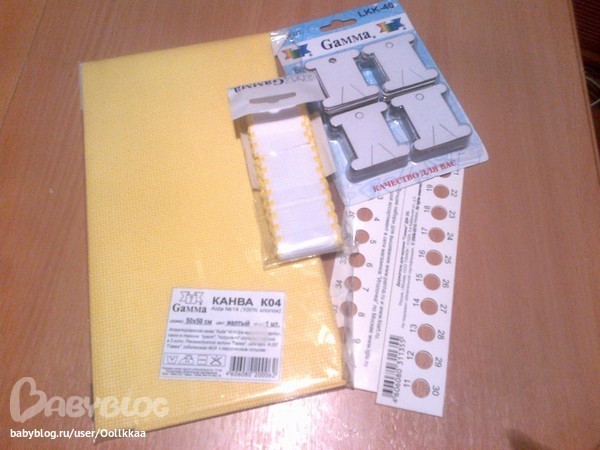 Желтенькая канва, канва ленточкой, бабины для ниточек и штучка для ниток (не знаю как правильно это называется)