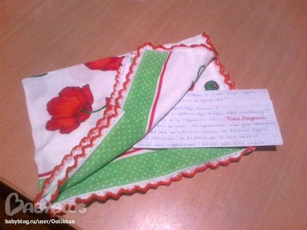 А это полотенешко для кухни,обвязанное ручками Танюси и письмо...с поздравлением и цу о подарках (очень помогли особенно для понятия что в различных пакетиках)