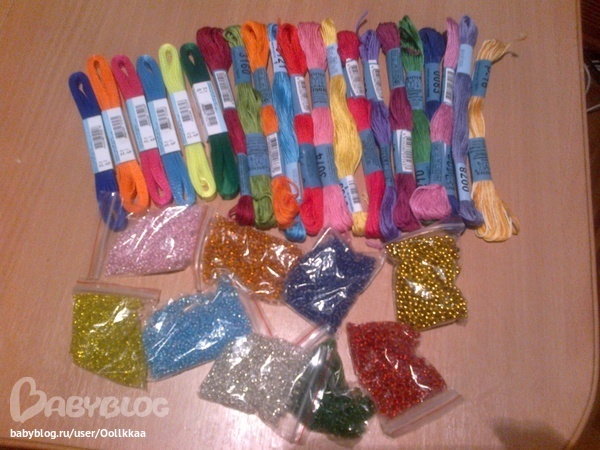 А это ленточки атласные, бисер (Танюш,ты прям как знала что я хочу найти бисер чтобы начать вышивку иконы,в наборе с которой был ужасный бисер) и ниточки в копилку для хомячка Ольки)))