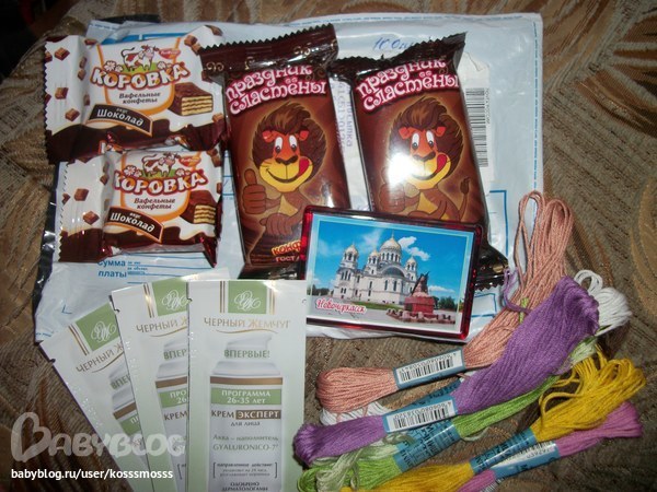 Превкусные вафельки =), ниточки для вышивки ( а цвета такие яркие, такие позитивные!!!) на фото так не отразить. И пробнички крема Черный жемчуг! (Уже намазёкалась после душа =)))))