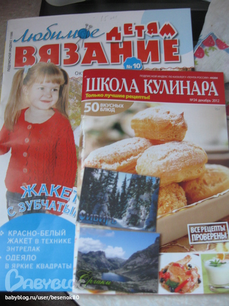 Солнышко,спасибо за чудесные магниты!!!!А еще кулинарный журнал в мою копилку и журнал по вязанию(надо начинать вязать,там красивые вещички есть))