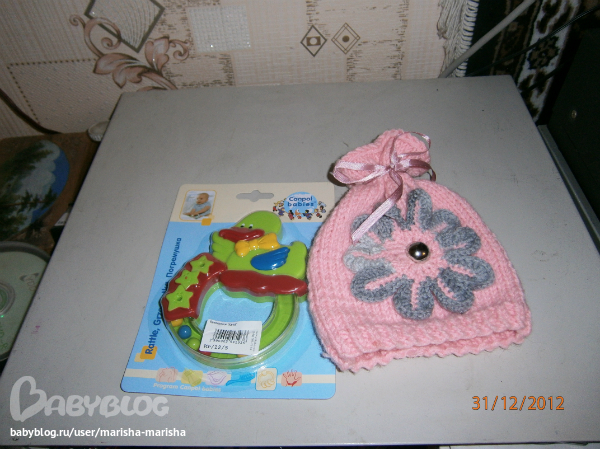 для Катюши просто сногсшибательная шапочка, которую Оленька связала сама, и погремушка, ее Катюха уже попробовала на свой первый зуб.