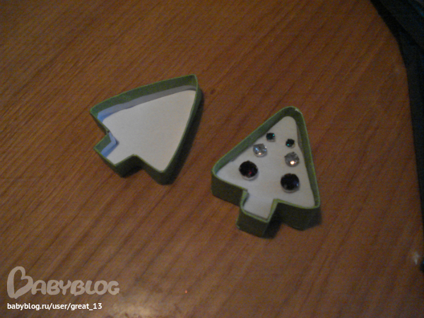 коробочка-ёлочка и внутри 3 пары гвоздиков для ушей)))