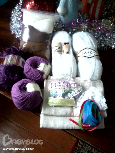 Белые ниточки-с люрексом, фиолетовые очень глубокого цвета, шерсть для валяния и тканюшки для пошива куколок, а еще ленточки-кружева-тесемочки)))))))))))