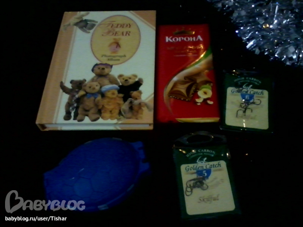 Альбом для фотографий, сладенькое, наборчики крючков, и коробочка для хранения рыболовных мелочей. Дедушка быстро все утянул в свой "гараж" ))))))) На днях он пытался у папы нашего "умыкнуть" коробочку под свои мелочи- не отдали)))) а тут прям в самую точку с подарочком))))))