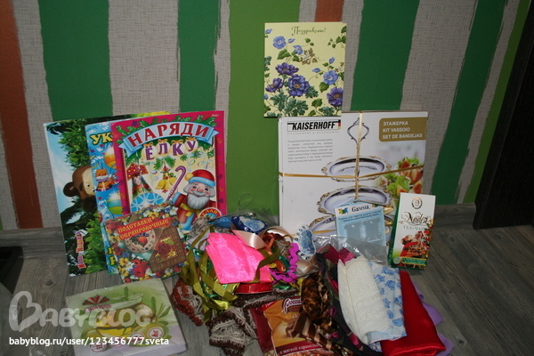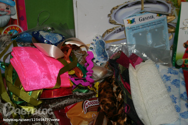 Огромную кучу подарков,куча ленточек, пуговички, паетки,тканюшки и много всего :