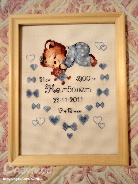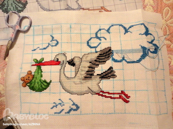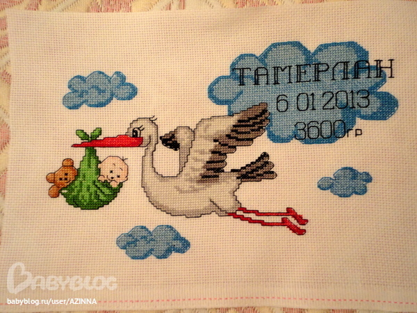 Спасибо,Танюша)))Метрика с Аистом-это мой первый подбор))Я скачала схему в интернете(плохого качества..с трудом разобралась) и выбрала нитки из тех,что были,кое-что докупила))
