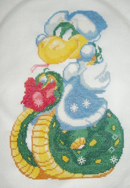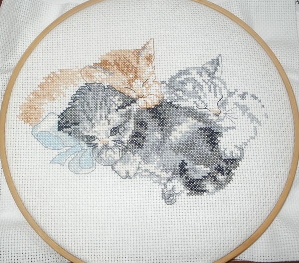 Всем приветик!!! Не уже ли ББ перестало глючить, или сие счастье нам не надолго??? пока писала счастье нас покинуло фотки снова не вставляются.... (далее большой звук пииииииииииии) На этой недельке я вышивала мало, и в экстремальных условиях. Так так скосил меня грипп и как всегда это счастие не прошло без осложнений. Подарком мне достался гайморит и гул в ушах и когда это закончится неизвестно. Сейчас нос дышит, но такое ощущение, что в ноздрю впихнули бусинку и она там катается, и ни в перед и ни назад, короче весело, но еще веселее от того, что от носа постоянно кружится голова, а особенно когда смотришь вниз, поэтому всю неделю вышиваю лежа, дабы не шевелить головой. Вышивала то, что  легче и поменьше - закончила котят, они такие лапочки получились, даже мужу понравились, хотя он против таких мелких картинок а еще у моей змеюки появилась голова, правда страшненькая без глазок, ну не успела я чуток было стало