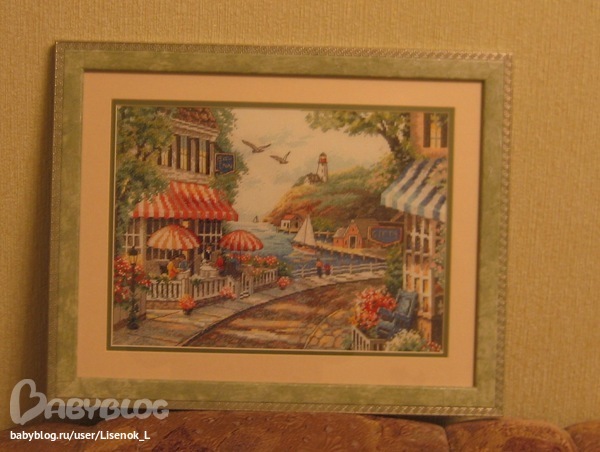 Вышивка крестом ГОТОВЫЕ РАБОТЫВышила и оформила кафе у моря. Все-таки Дим есть Дим1 Картина смотрится как живая, жаль фото не очень получилось ((