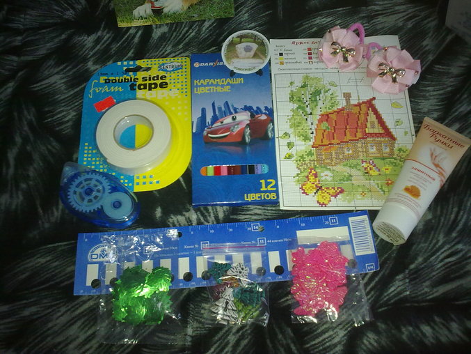 Теперь у меня есть схемка домика, кот. я давно хочу вышить. Схемы с компа мне надоели. я люблю подержать в руках, нормально посяитать. Карандаши Маргарита схватила сразу, 1 резинку я нацепила ей на волосы, сразу побежала к папе показываться. Мы ходим в садик на кружок, мало того, что она самая красивая (честное слово), самая длинноволосая, так еще с такими резиночками фарсить будет! Крем я отдала мужу - он с сухостью рук очень мучается. С органайзером у меня теперь ваще полный порядок будет в сундуке с нитками! Липкая лента и объемный скотч - то, что нужно. Я засматривалась на эти вещи в Цуме, но жаба меня часто душит. Тарелочка-магнитик супер, ваще все супер!