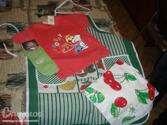 "Всем сестрам по серьгам" - Егорушке балдежная футболка (к лету будет как раз впору!), мне фартук, полотенечко и суперские носочки