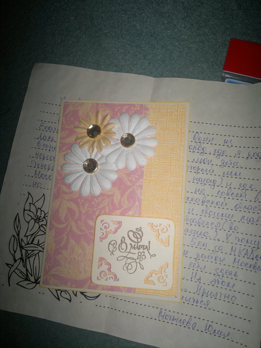 Еще письмо ручного написания и скрап открытку.Открытку такую сделанную своими руками держу впервые. Она такая красивенная.