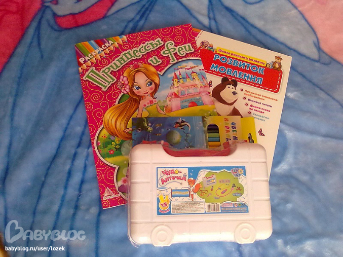 А это моей девушке подарки, раскраски, карандаши, книжка для развития речи, какраз этим сейчас активно занимаемся. И набор доктора в чемоданчике, давно дочке хотела купить.