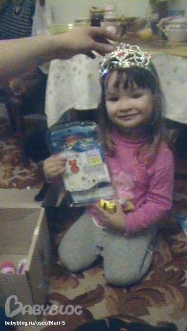 ( одна шоколадка уцелела). А Кирочка просто в восторге от телефончика- мы её со скандалом еле уложили, так она хотела спать вместе с ним!!!!!! Книгу читали перед сном, ну а конфетки слопали одну вечером а одну как только встала, да ещё и втихаря!!!!