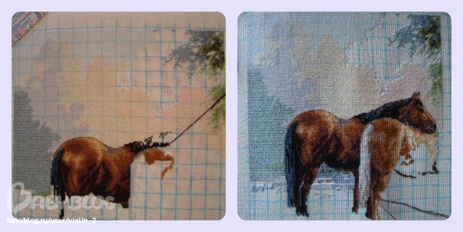 Привет,девочки!Что-то я ступила..комментирую всех,а сама не выложила ещё отчёт)..Вот отчётик..почему-то фото получаются плохого качества(..хотя канва у меня мелкая 18..а всё клетками..фиг поймёшь..но вживую очень классные лошадки)))мне набор этот не очень нравился когда начала шить(мне его подарили).но всё больше в него влюбляюсь в процессе)))