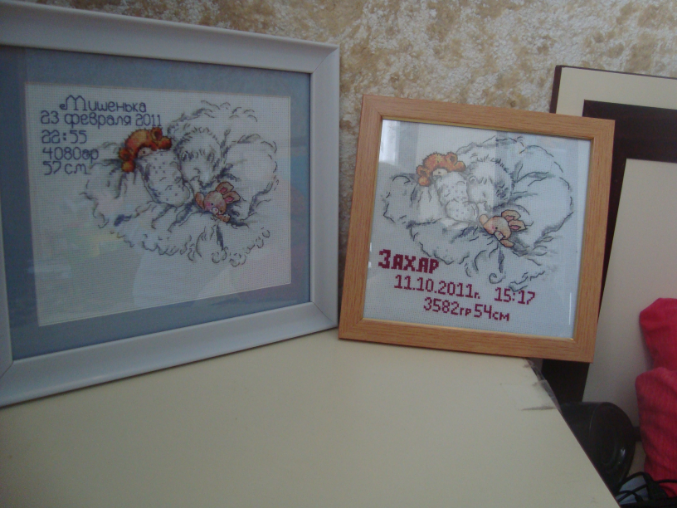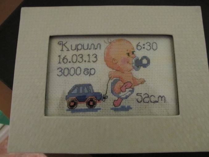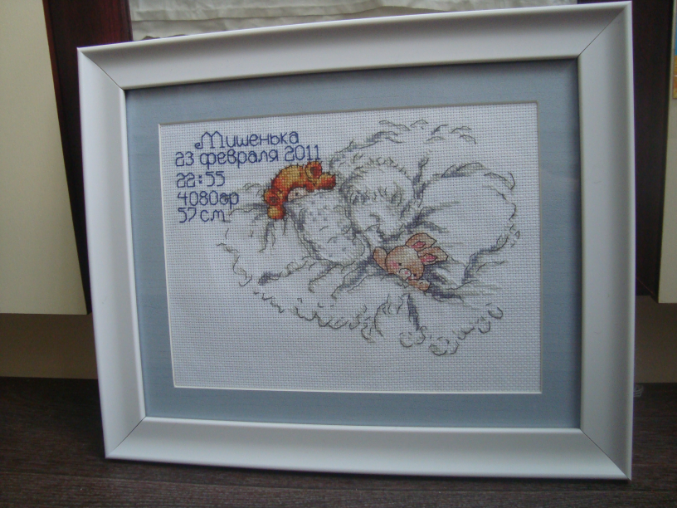 Вот эту такую же метрику вышивала своему сыну (это первая моя работа крестом вообще). Она была куплена набором. И вот совсем недавно оформлена....