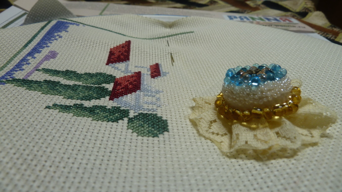 да брошку я недели три шью 2-3 шью потихоньку, там микробисер а под ним валяла на пальто дочери бусинки вот лишняя осталась...