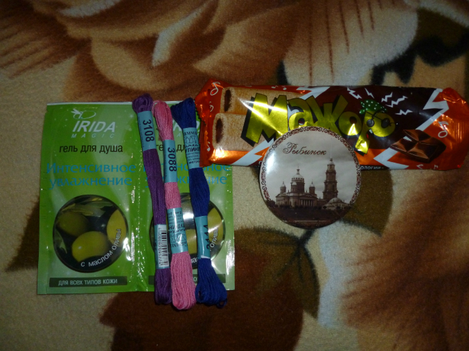 Общий план))) В посылочке были ниточки для вышивания, гель для душа, магнитик и вафельки (которые съели сразу)))