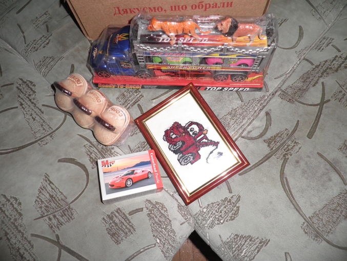 Вот всё богачество малого :)) Машинку ели упросила для фото.. мы, как забрали её с посылки прям на Почте, так и не отпускиали с рук... Даже мыться ходили с маленькими... И в садик сказал пойдет с ними (маленькими):)) Большие не разрешают приносить...