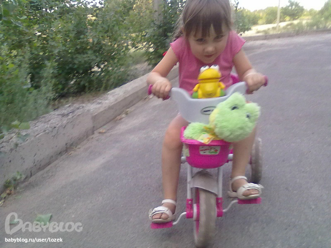 А это та самая мягко-пушистая лягушка, оля просто обажает именно такие мягкие игрушки они очень нежные на ощупь, жабка подружилась с лягушкой на Олином велосипеде.