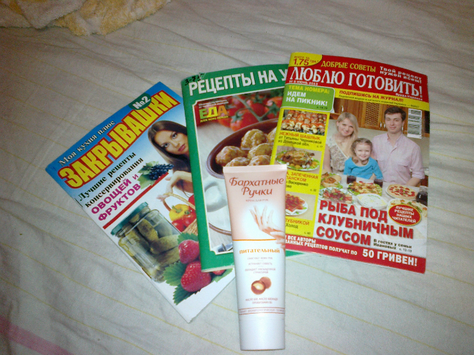 А это для меня богатства. Журнальчики и крем для ручек. Буду искать новые рецепты, что поражать своих любителей покушать;)