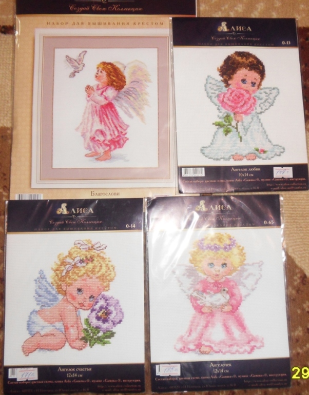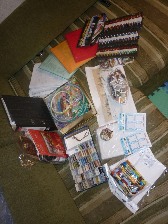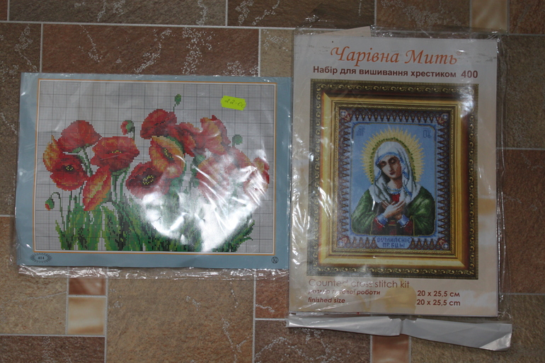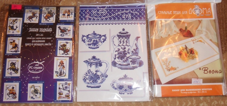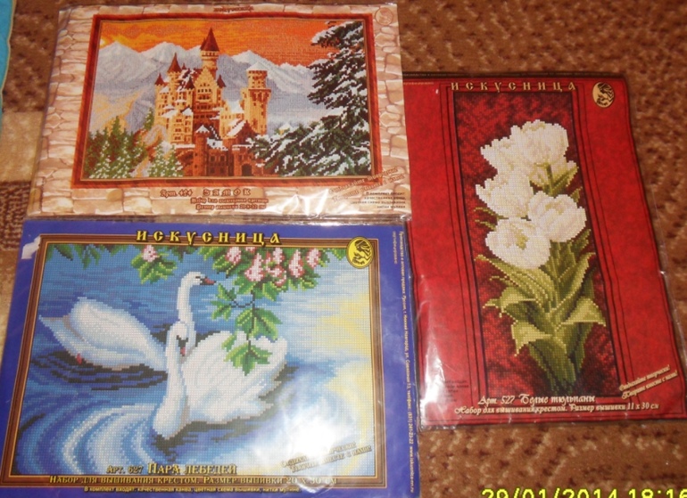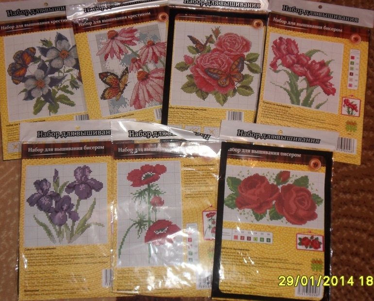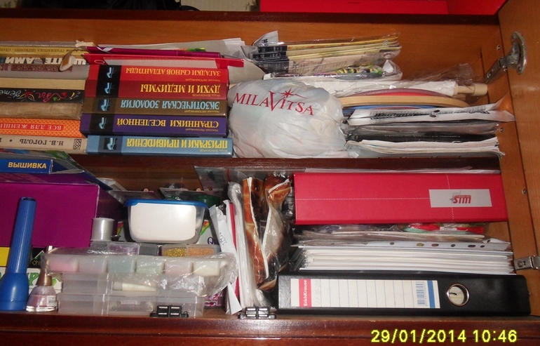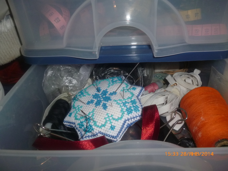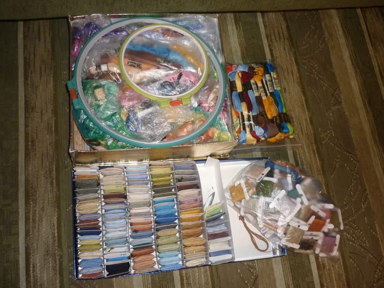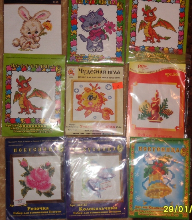 Ну а теперь вторым постом покажу свои запасы. Думала что их не много, лежат они у меня в стенке, компактно, в одном ящике, наверху (переложила в начале лета, когда мое дитятко стало лазить везде, и пытаться все пощупать. раскрыть и т.д.), а когда стала разбирать поняла что у меня хомяк толстый-претолстый.Вот здесь все храниться: Все это: наборы которые я покупаю на протяжении последних 6 лет (с 2008 года), канва, ниточки ( в пакетике из под милавицы, там есть еще даже остаток косы, который достался от бабушки) , 3 коробочки с бисером (причем часть бисера осталась со школьных времен, когда училась бисероплетению), две папки с журналом вышиваю крестиком, коллекция от хатчер., папка с файлами, где хранятся отшитые наборы, схемы и остатки от наборов отшитых, которые отдала подруга., а также рамки и несколько пялец, разного размера.Мои наборы:1 Маленькие наборы искусница, алиса, чудесная игла, пс студия. Колокольчик и розочку видно плоховато, это бисерные наборы.  Розочку вышивала два раза уже, подбором. Оба раза подарила, Первый подбор есть в дневнике, второй раз забыла сфотографировать. Оба раза кому дарила были очень довольны.2. Наборы бисером: а) роза (подарил муж на  2-х летнюю годовщину свадьбы) б) Икона Богородица Милующая в) Икона Георгий Победоносец (подарил муж в этом году на крещение) (Причем ходил выбирал сам, обошел три магазина, пока нашел. Сделал мне сюрприз) г) Наборы с бисером (4 шт.) из фикс-прайс, и там же наборы  для вышивки крестиком (3 шт.) из того же магазина. (Подарили родственники на новый год,  сказали раз вышиваю, а картинки красивые, означает, что вышью.)  3 Наборы крестиком фирма Искусница (Нижний Новгород)а) три набора, где размечена канва, разложены ниточки, то есть подготовленные к работе. б) три набора даже еще не вскрытые 4 Набор Золотое руно  "На выгоне", размечена канва карандашом,  все готово к вышиванию, но канва мелкая поэтому пока отложила. 5. Наборы фирма алиса 6. Пять наборов фирмы Панна 7.  2 набора РС-студия, 1 набор Овен 8 Подушка ( у меня в ней голубая канва) 9 Чистая канва и часть ниток Вот большая часть моих запасов. Итого у меня получилось 9 маленьких наборов, 7 наборов фикс-прайс, 23 средних и больших. А еще 2 набора которые вышиваю в ВД.Девочки я не хвастунишка, просто за 6 лет первый раз сделала такую фотосесию для своих запасов.( и сама пришла в "ужас", когда успела так затарится) За  6 лет вышила 10 работ по наборам из них только 3 большие, и 4 картинки в авантюрах.  Вот сижу и думаю сколько времени потрачу что бы вышить этот запас. (Но ничего не будем унывать, у меня мама тоже вышивает, значит часть этого запаса, можно будет ей отдать и тогда будим дальше пополнять)Спасибо всем кто просмотрел, и прочитал мой пост.