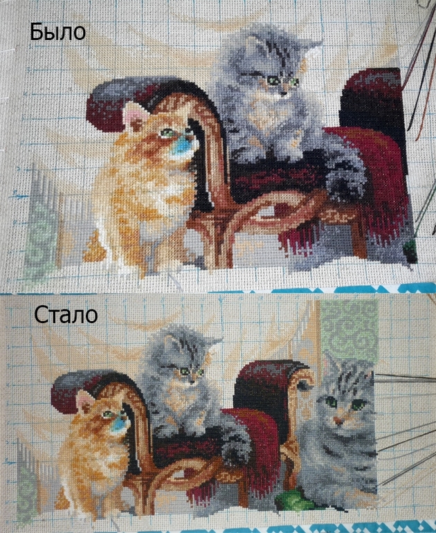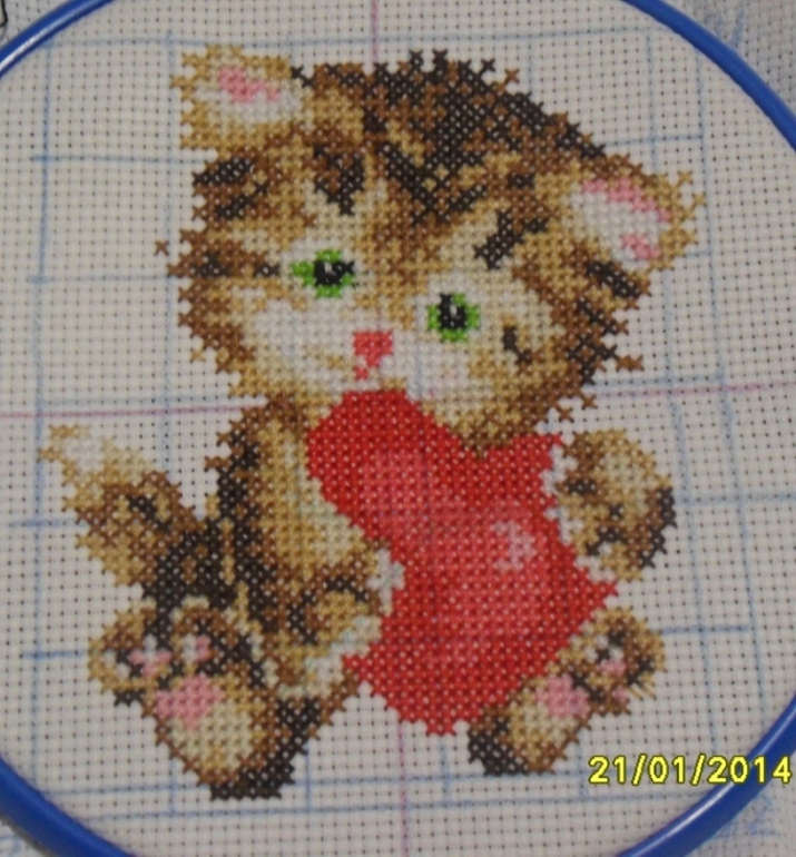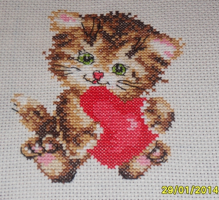 еще одна киска вышилась,хороший темп работы пошел. Да ниточек много.А как делали самодельный органайзер,тоже надо ниточки свои расфасовать