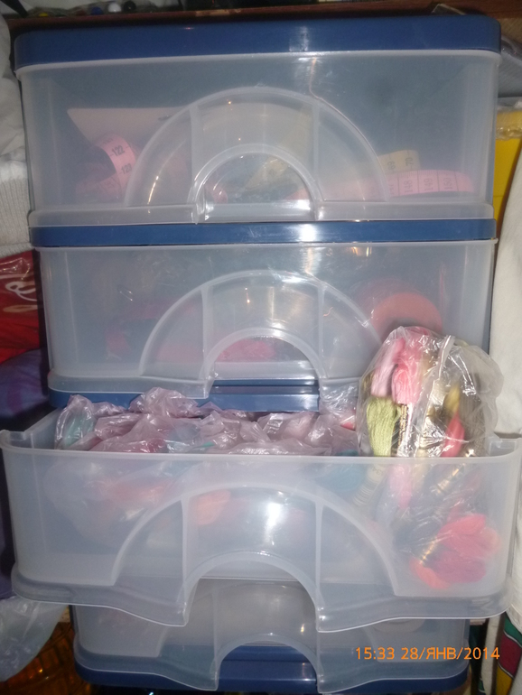 Всем привет! Мне тоже уже хочется лето, надоело ребенка постоянно одевать как капусту, которыйнаровит убежать )Вот мои успехи на этой неделе.Чуть-чуть не доделала верхнюю часть А вот мои запасы, сначала общий вид, а потом подробнееА теперь подробнее. Запасов наборов у меня нет, то что сейчас вышиваю, это последний. Но есть пару начатых работ подбором и большой Китайский набор. По папкам разложены схемы для вышивки и вязания, выкройки для шитья и мягких игрушек Канва 16 и 18, немного бабин и бискорнюшка под иголочки 5 самодельных органайзеров под ниточки, всегда при деле они) Ну и запасы ниточек. Что-то перемотано и разложенно, но основная масса лежит в коробке по цветам в мешочках. А небольшой отдельный пакет, это недавно пришедший заказ ниток ДМС под задуманные небольшие вышивки. Ну и конечно же пяльца. Еще скоро должен прийти набор алмазной вышивки, который жду с нетерпением )