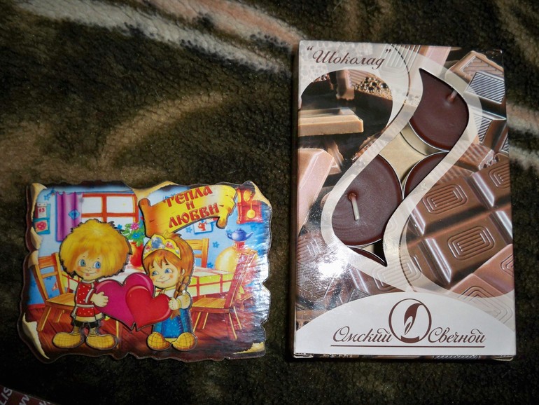 Магнитик (уже занял своё место на холодильнике) и свечи с шоколадным ароматом (для романтики в самый раз)