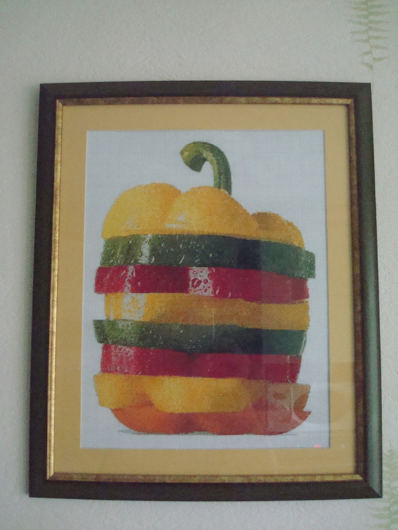 Ирина, спасибо!)) Гигантомания у меня))) Когда только подсела на иглу вышивала всяко разно, но потом пришла к тому, что тратишь время, а работы потом не интересны или интересны только тебе, и вследствие чего валяются, пылятся. Легче всего пошел перец-светофор — радужный позитив такой. Друзья приходили и не могли понять, что это вышивка, даже трогали руками, настолько все натурально, особенно капельки воды, как настоящие))