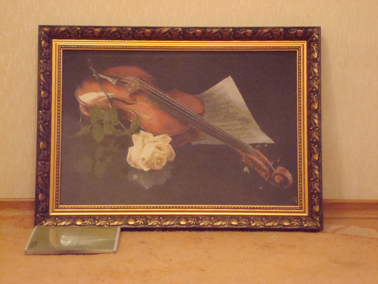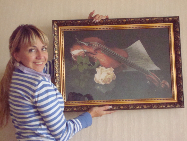 Анечка, спасибо! Скрипка классная, сама на нее запала, но подарила своим друзьям. Она им больше по интерьеру подходила.Черный фон тоже вышит и нравиться, что отражение легкое видно.Схему брала, но отдала ее уже подруге, судьбу схемы не знаю)