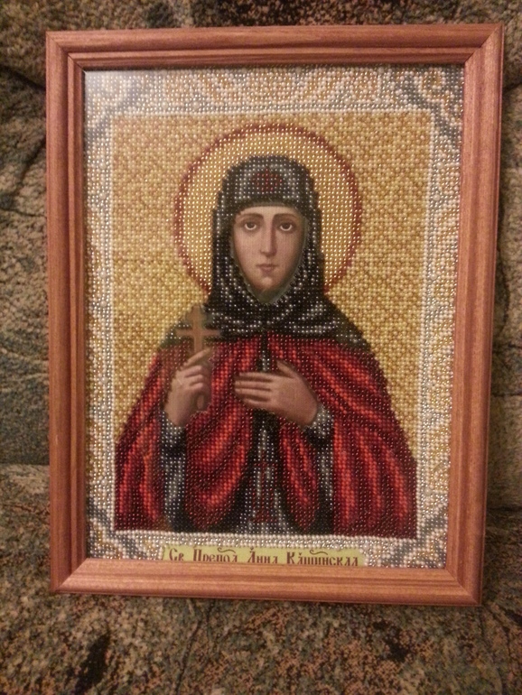 Икона святой Анны!Мать богородицы!Она была бесплодной,и вымолила Деву Марию к 60 годам! Я тоже Анна.Вот и решила вышить ее икону! Уже давно не могу забеременеть,только когда вышила икону узнала что нужно просить Св.Анну при недугах связанной с беременностью!