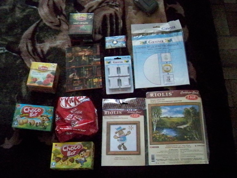 Подарок просто потрясающий. Сладости ням ням нам очень пришлись по вкусу. Чай я обожаю, отгадала даже какой я люблю. Вышивки тоже супер, овечку уже почти закончила. Открытку такую 3D я вижу впервые, в нашем городе точно таких нет. Магнитик занимает своё почётное место на холодильнике.