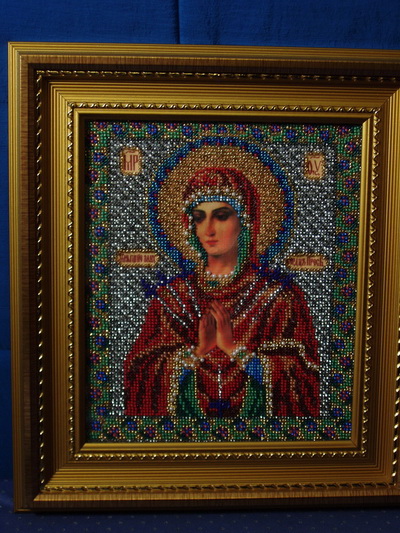 Вот хочу поделиться недавно сделанной работой. Моя первая вышивка. Чешский бисер, рисунок на канве. Рамка, правда, пластиковая. Но, на хороший чешский бисер рамки лучше заказывать в багете деревянные. Лучше смотрятся. Вышивала, наверное, полгода. Икона Божией Матери "Семистрельная" или "Умягчение злых сердец". Размер вышивки 18х22 см.