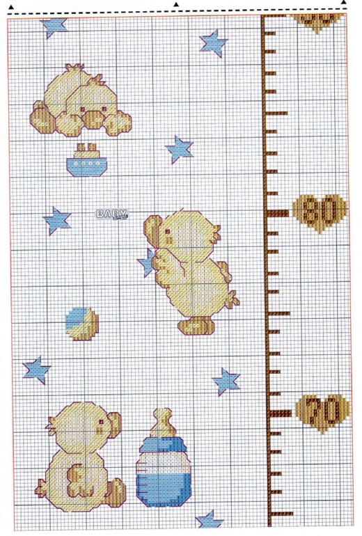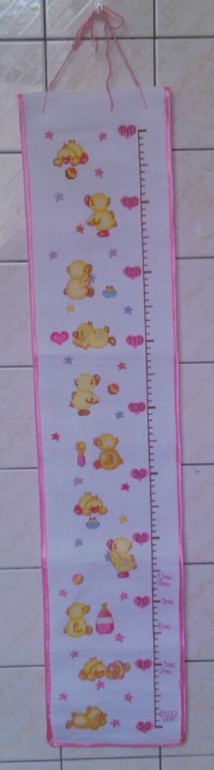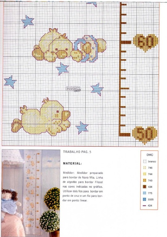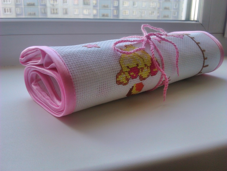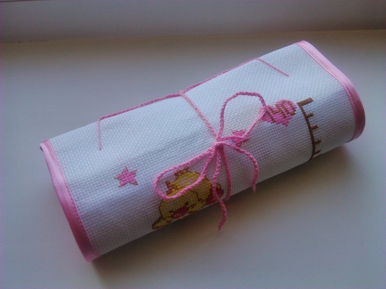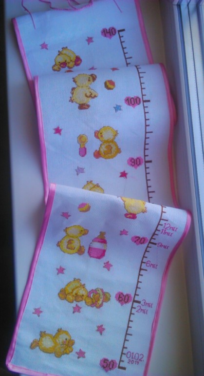В ключе всего 7 цветов, мотивы похожи и повторяются. Для девочки в схеме кое-где заменила голубые цвета на розовые! По контуру обшила косой бейкой, из нитей ирис набрала цепочки из воздушных петель для крепления ростомера.