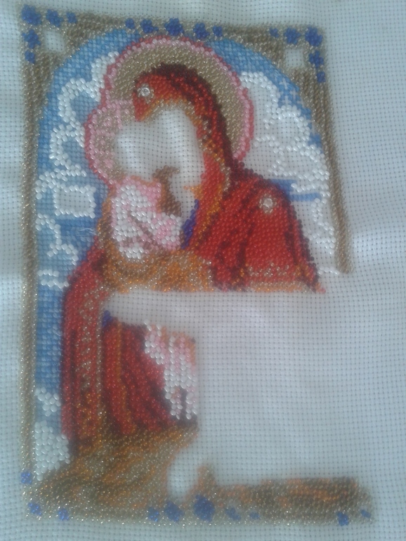 А теперь недоделки : бисерная икона ( ну никак у меня к бисеру душа не лежит ), домик сейчас доделываю и частичная вышивка ( подарок свекрови, картина красивая, но не люблю рисунок на ткани )
